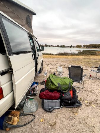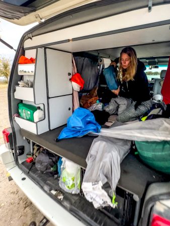 Das Dachzelt einzufahren ist hierbei der kleinste Teil. Doch kram mal den Kram von monatelangem Durcheinander notfallmäßig so zur Seite, dass unten im Magicbus ein Himmelbett entsteht. Quasi unmöglich.