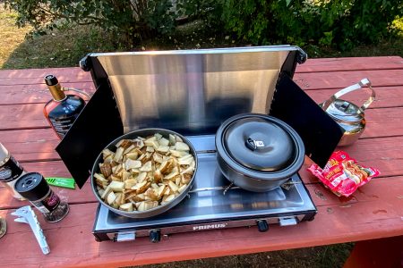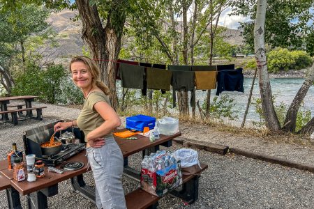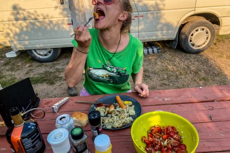 Auch mal wieder schön: ein bisschen normales Campingleben. Mit warmem Essen vom Campingkocher mit Gaffeegochkas und später mit einem Bierchen am Ufer.