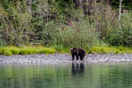 Am Strand gegenüber, ca 60 Meter entfernt, läuft ein riesiger Grizzly in unsere Fluchtrichtung. Nase am Boden, suchend, mit großen, schweren Schritten.