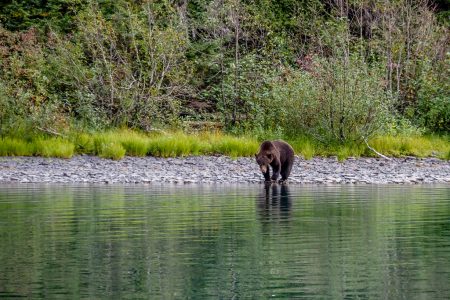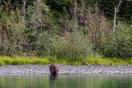 Der Grizzly dreht sich wieder um und fixiert uns genau. Soviel dazu: „in die Flucht geschlagen“. Er wollte nur ablenken, dreht sich erneut zum Wasser hin und setzt sanft die Vorderpfoten in den See.