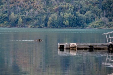 Am Steg sind wir als erste. Dort flieht gerade ein schwitzender Einheimischer: „It´s a grizzly.“ Yes, we know : Ein Grizzly auf dem Wasserweg zum Campingplatz. Um sich das Abendessen servieren zu lassen, was er soeben erschnuppert hat. Uns. (Phantasie an Großhirn)
