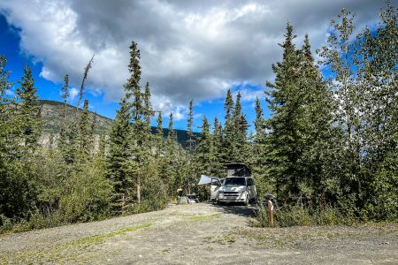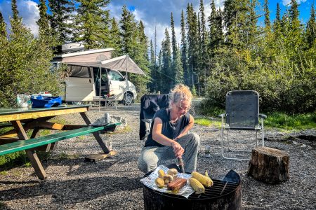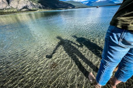 Mut aber hast Du. Genauso wie die zahlreichen Libellen, die auf mir Platz nehmen: wohl eher weniger mutig, denn vom betörenden Geruch angezogen. Fließend Wasser gibt es auf kanadischen Territorial campgrounds nicht. Wir hatten noch feuchte Tücher, von denen Libellen sich aber anscheinend nicht austricksen lassen…