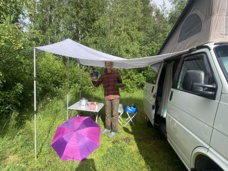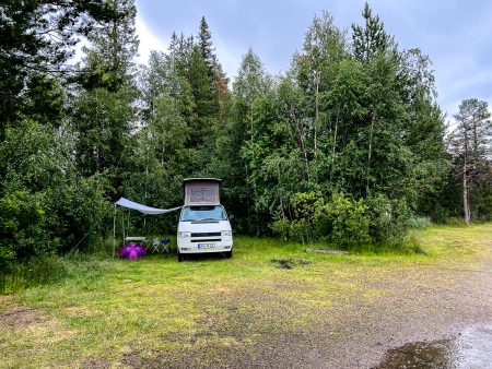 Der einzige Platz mit Privatsphäre ist unserer – alle anderen müssen sich später in Reihe und Glied nebeneinander reihen. 200 Kronen in den Briefkasten, nun können die dicken Tropfen problemlos kommen. Natürlich tun sie das auch.