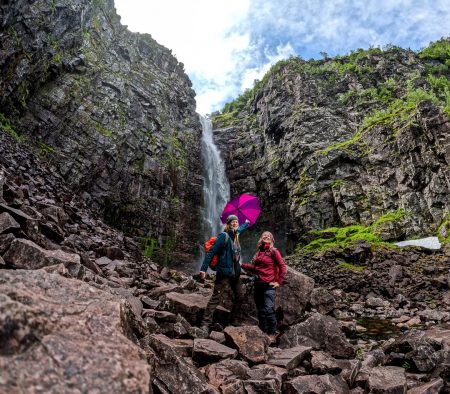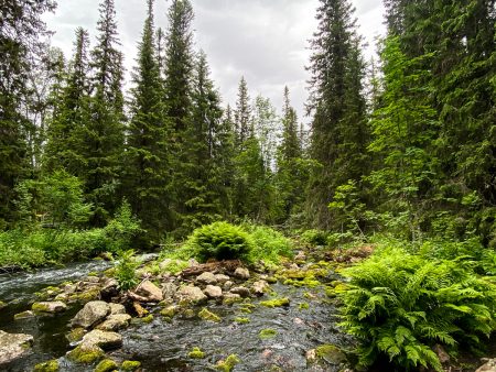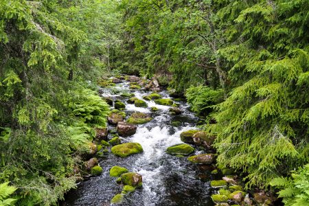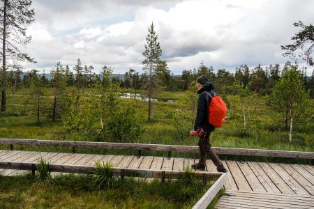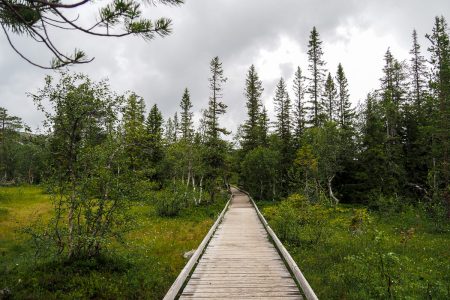 Für die Tausendsasser der Naturliebhabenden wurden gemütliche Stege angelegt, um erst durchs Marschland mit seinen Puschelblumen zu wandeln, das sogleich in nordischen Urwald mit verschlängelten Flüsschen übergeht. Rentierflechte zwischen alten Steinen und Moose auf den Rinden, Farne greifen nach den Wandernden, die alle früher oder später gen Njupeskär streben.
