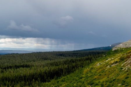 Auf dem Gipfel angekommen unterstreicht auch Thor die Notwendigkeit, langsam zu machen: er schwingt seinen Hammer und donnert. Einmal, zweimal, dreimal. Bis zum alten Tjikko ist es noch einen Kilometer über die baumlose Bergflanke, während wir dabei zuschauen können, wie das Unwetter von Weitem über die Ebene ankriecht.