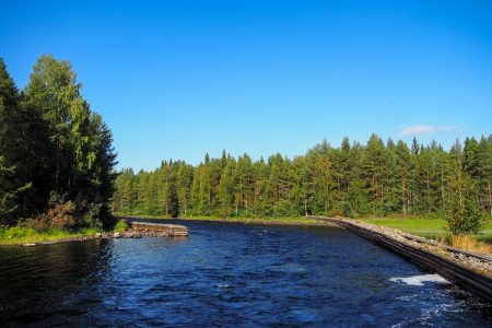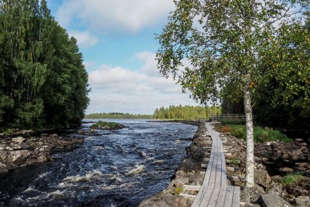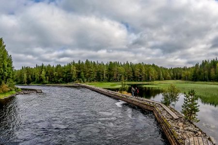 Nach einer Viertelstunde spuckt uns der boreale Nadelwald am Ufer des Verbindungsflusses zwischen „unserem“ See und dem Lentua aus. Weiter müssen wir über eine sich auflösende finnische Brücke, deren Bohlen vielleicht vor Äonen mal intakt waren. Was übrig blieb sind dicke Steine, jeder zweite davon wackelig. Ein Knöchelwupper wie er nur in schaurigen Märchenbüchern zu finden ist.