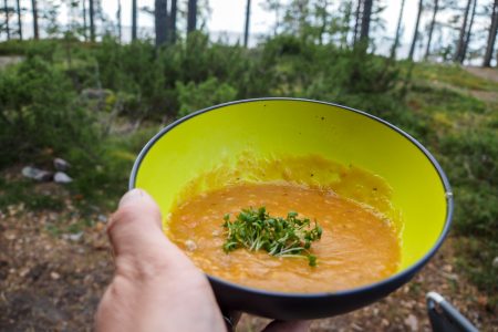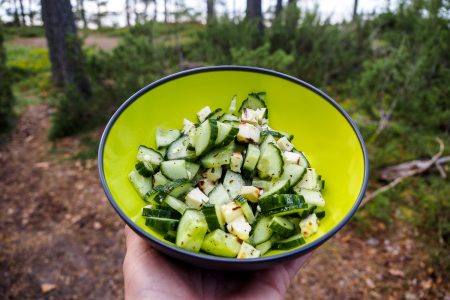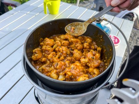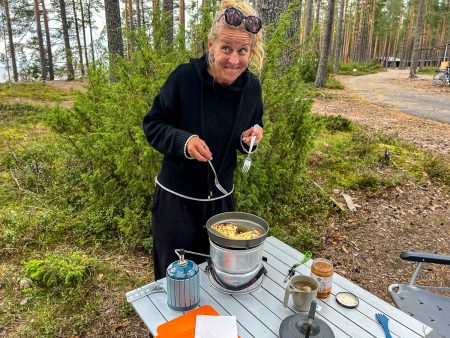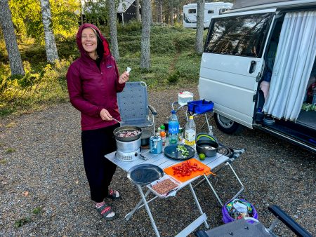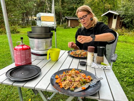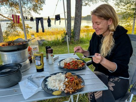 Zum Abend gibt es veganes Gyros mit Paprika und Reis – gekocht auf der Mitte der Wiese des Camps, damit die Haare sonnentrocknen können.