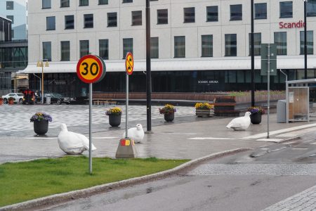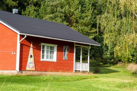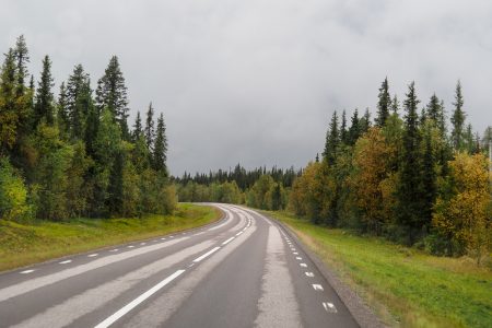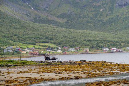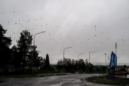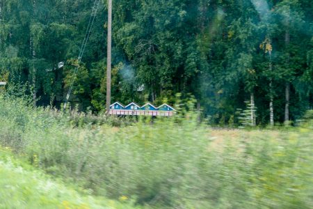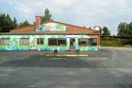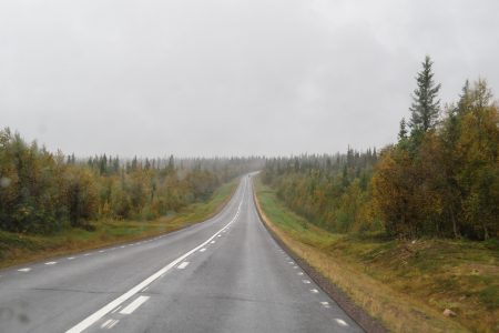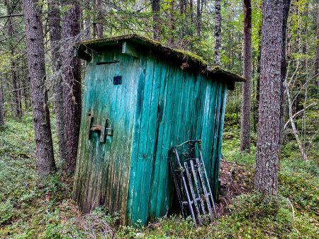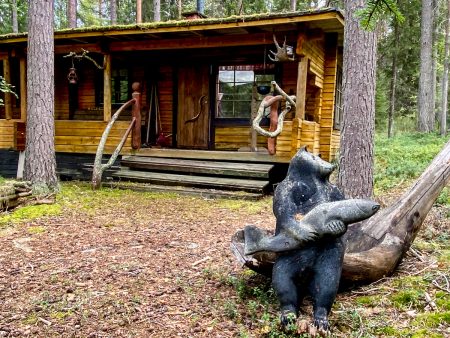 Wieder passieren wir dichtes Dickicht. Eine Hütte im Nichts, vor deren schütternen Schuppen ein Schlitten aus den 70ern auf die Kinder von damals wartet. Eine Bärenskulptur mit Fisch, die in einem endlosen Winter mit blauen Fingern geschnitzt wurde, wartend unter einem Elchgeweih auf den zahnlosen Aussteiger, dem die Welt nichts mehr zu sagen hatte.