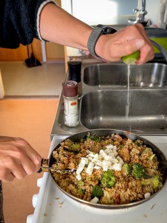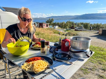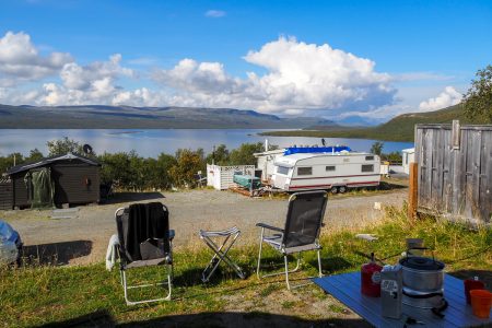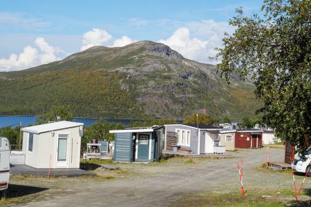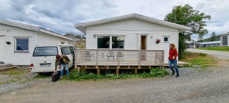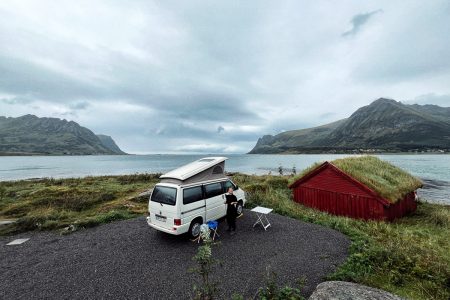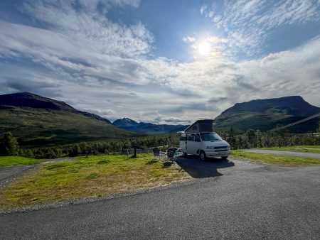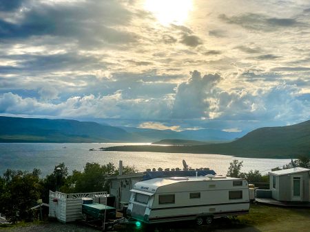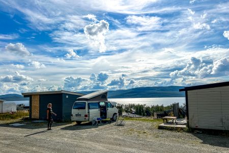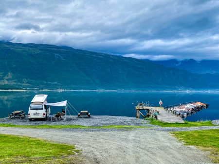 Das Camp liegt zwischen Bergriesen. Wir parken neben dem roten Häuschen mit Grasdach ein – und Fjordblick zu drei Seiten.