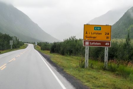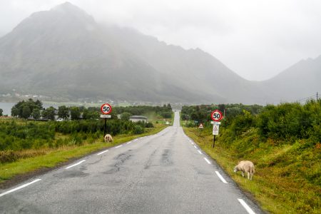 Wir sind es, die lediglich zu trottelig sind, um uns vernünftig zu lokalisieren. Hinter dem Mopedfahrer, der auf der schrägsten Schräge und mitten auf der Straße hält, um sich wetterfest zu machen taucht ein Schild auf: Lofoten: noch 49km.