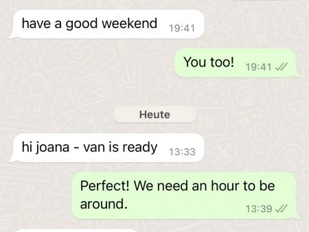Um kurz nach halb zwei, die Füße sind nach 14 Kilometern schon wieder müde, bimmelt plötzlich mein Telefon. Sie haben Post: „hi joana – van is ready“.
