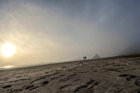 Kleiner Verdauungsspaziergang zum Strand. Bei Nebel mit einem Hauch Sonne. Wir erwarten eigentlich nichts anderes als das, was uns seit ein paar Tagen schon beglückt: Pazifik im Schwanzpuckelwetter eben. Doch Oregon soll uns auf ein Neues überwältigen.