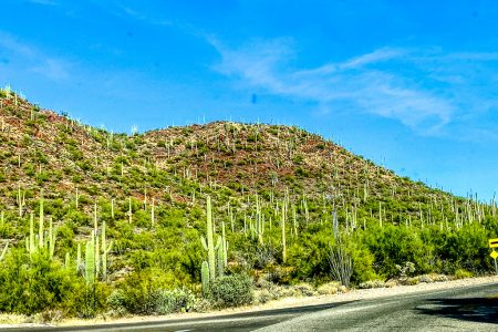 Hinter der Stadt tauchen die ersten Saguarokakteen auf. Ein guter Grund, aus der Fahrlethargie –ganz ohne Übergangsfrist– direkt rüber in die volle Euphorie zu gleiten. Beim Anblick dieser stacheligen, stummen Riesen kann man gar nicht anders: man muss einfach vollkommen aus dem Häuschen geraten. Monsterkaktusse – wie TOLL ist das denn bitte!?