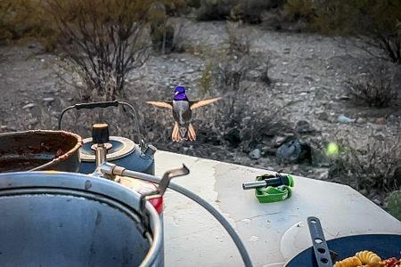 Ein Kolibri –flotteste Flügelchen, lila Kopf– schwebt ganz vertraut und neugierig über dem Teller — fast so, als wolle er landen. Und kurz darauf geht –natürlich– eine Sonne unter im knalligsten gelb und orange, das der Himmel zu bieten hat.