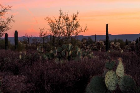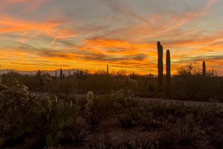 Trotz allem knattert uns der Magicbus tapfer durchs Gelände. Nur einmal quiekt er kurz: aus Enttäuschung, dass wir –tief im Sand vor einem Ranchtor auf dem groß und breit „Private property“ statt „camp“ steht— wider Erwarten für heute doch noch nicht da sind. Und dann ist das Glück uns hold: auf dem eigentlich immer überlaufenden Statecamp direkt am Saguaro National Park hat es noch ein Plätzchen für uns. (Fürs Phantom: H24) Kurz vor Sonnenuntergang.