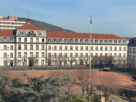 Der Blick aus unserem Fenster geht auf den Exerzierplatz des 92. Regiments der französischen Infanterie. Junge Menschen joggen durch einen zarten Frühlingsmorgen im Zentralmassiv — bestenfalls für den Frieden. Nun gut, dafür macht es ja vielleicht auch Sinn aufzustehen: für megalomanes Pilgern für den Weltfrieden. Die Vulkankathedrale in der Ferne blickt stumm und dunkel.