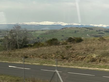 Schlierige Sonne über dem Zentralmassiv, ungewöhnlich warm mit 17 Grad für Ende März. Auf fernen Bergkuppen aber liegt noch Schnee.