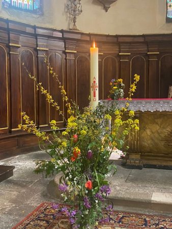 Wir besuchen die Kirche mit prima Osterblumen und nettem Mann auf Treppe.