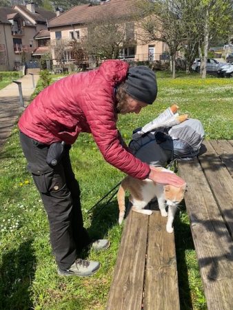 Heute erwischt es uns. Mit sehr schweren Tropfen auf den Köpfen spült es uns bis zur Katzenlady Valerie. Für heute sind wir angekommen.