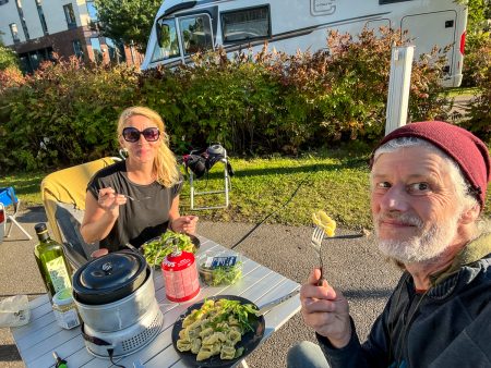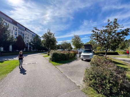 Auf Platz F03 werden wir eingewiesen – einer von schätzungsweise zweihundert Plätzen, alle im Vorschatten neuer Wohnblocks hinter Zaun. Eine niedrige Hecke, in der gebrauchte Taschentücher hängen, trennt uns vom nächsten Wohnmobilnachbarn, der soeben sein Luxusmobil lautstark hydraulisch hochfährt, danach richtet er die Fernsehantenne aus.