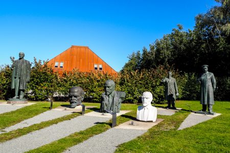 Reste kommunistischer Vergangenheit stehen grau und bedrohlich im Rest der sonnigen Parkanlage herum.