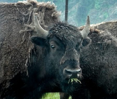 Die Bisons starren uns mit großen Augen an. Der größte unter ihnen schnaubt, taxiert den Bulli genau, bei dem –nur einen Meter weiter– nun vollkommen wumpe ist, ob er neues Öl hat. Ein neuer Kuhfänger wäre besser gewesen. Wobei – bei einem Stockmaß von 2,5m wäre auch der ziemlich überflüssig.