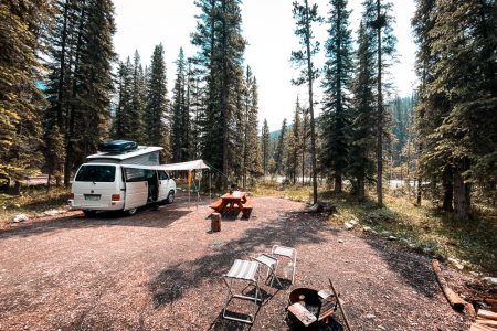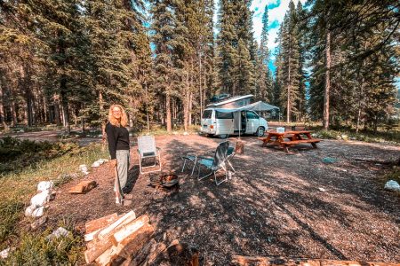 Nach knappen 100 Kilometern geschwungenem Grün zwischen majestätischen Bergriesen und 2000ern Pässen (die der Magicbus wirklich ganz hervorragend meistert. Chapeau, alter Junge. Bei so viel Arbeit darfst Du auch singen…) dürfen wir für heute auf einem der letzten freien Plätze im Rampart Creek zu Hause sein. Für eine Nacht im Himmel.