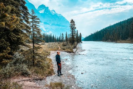 Und so stehen wir hier nur 10 Meter entfernt vom weiß rauschenden, laut wispernden North Saskatchwan River im dichten Wald. Die Lichtung ums Eck flüstert von Elchen, an Campsite Nr 8 wurde vor ein paar Tagen noch ein Schwarzbär gesichtet, Welt im Urzustand. Heute ist Zeit auf den Fluss zu hören, beschützt durch die Rockys, schneebedeckt.
